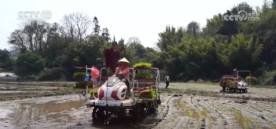 正在赣州定南县岿美山镇的农田里,旋耕机和插秧机交替功课。旋耕机翻耕平整过的地盘,插秧机再颠末之后,秧苗就划一地栽插到田里。正在不远处的边角地块里,农户们正正在手工插秧。