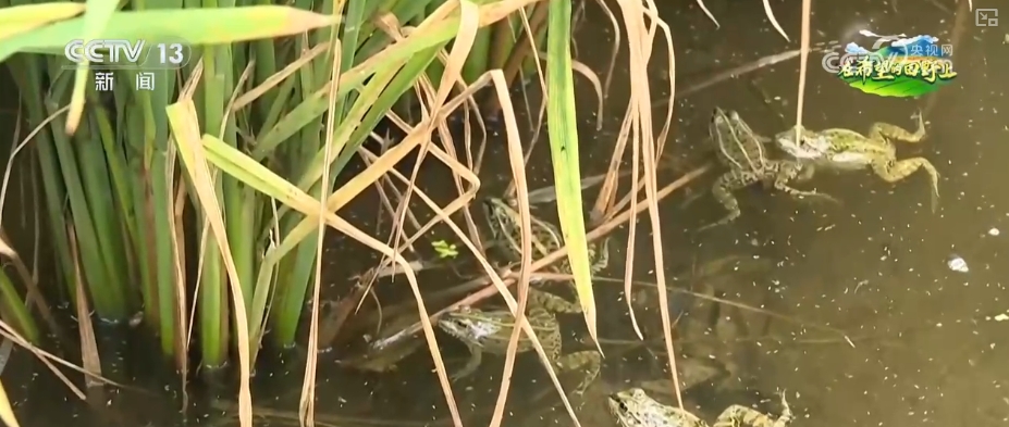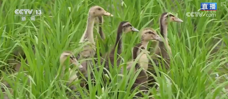小鸭子们喜好吃稻谷,它们会不会把稻田里的谷子也吃掉?为了防止如许的环境发生,这里采用的模式是“鸭蛙稻”模式,5月放鸭、7月放蛙,正在水稻进入抽穗期,也就是有稻谷的时候,15万只小青蛙就会来接力办理这片农田,由它们来捕食害虫,替代杀虫剂。